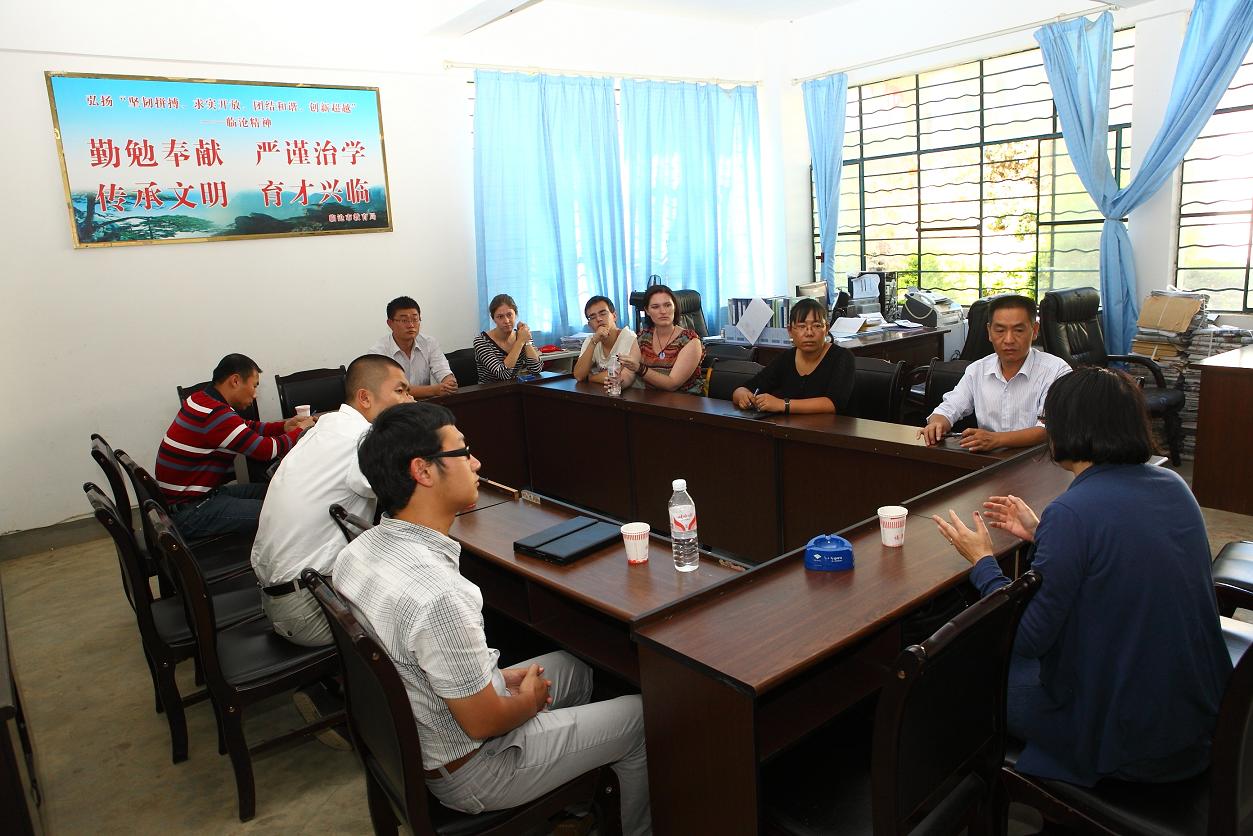 临沧市是滇西较为贫困落后的地区之一,山大沟深,道路崎岖,贫困面较大。调研组一行来到云县昔木小学,与村干部交流,慰问贫困家庭孩子,讲解国家的教育扶贫政策,鼓励他们发展教育,改变贫困面貌。在忙怀中学,调研人员与学校负责人以及“美丽中国”支教的中外青年教师进行座谈,了解了学校发展的主要困难和支教教师的教学及生活情况,并结合听课情况讨论了教师配置和教学方法改进的思路等。同时,还对“美丽中国”支教活动在贫困地区进一步的延伸以及青年教师职业规划等问题进行了深入探讨。在凤翔中学,调研人员认真听取学校管理方面的主要问题和学校“保安全、保稳定、保提高”的含义和原因所在,最后,与相关人员从教育与学校、教育与家庭、教育与社会等角度进行了治校策略方面的交流。期间,调研组还深入教师办公室、教师宿舍、学生宿舍、食堂、养殖场,了解当地办学基础设施、学校布局、教育信息化、素质教育等情况,实地查看学生宿舍和食堂,重点了解寄宿学生的生活条件,并结合实际情况,对国家实施农村义务教育学生营养改善计划后,学校的供餐营养搭配、学生生活费收取等详细情况进行了深入了解。